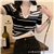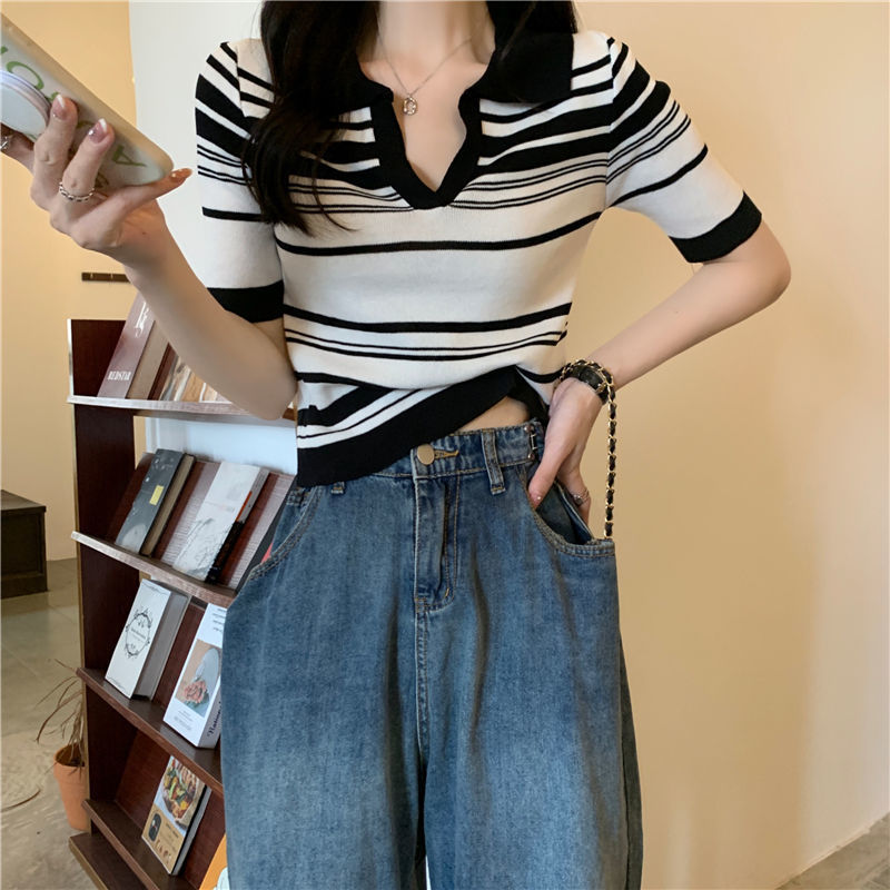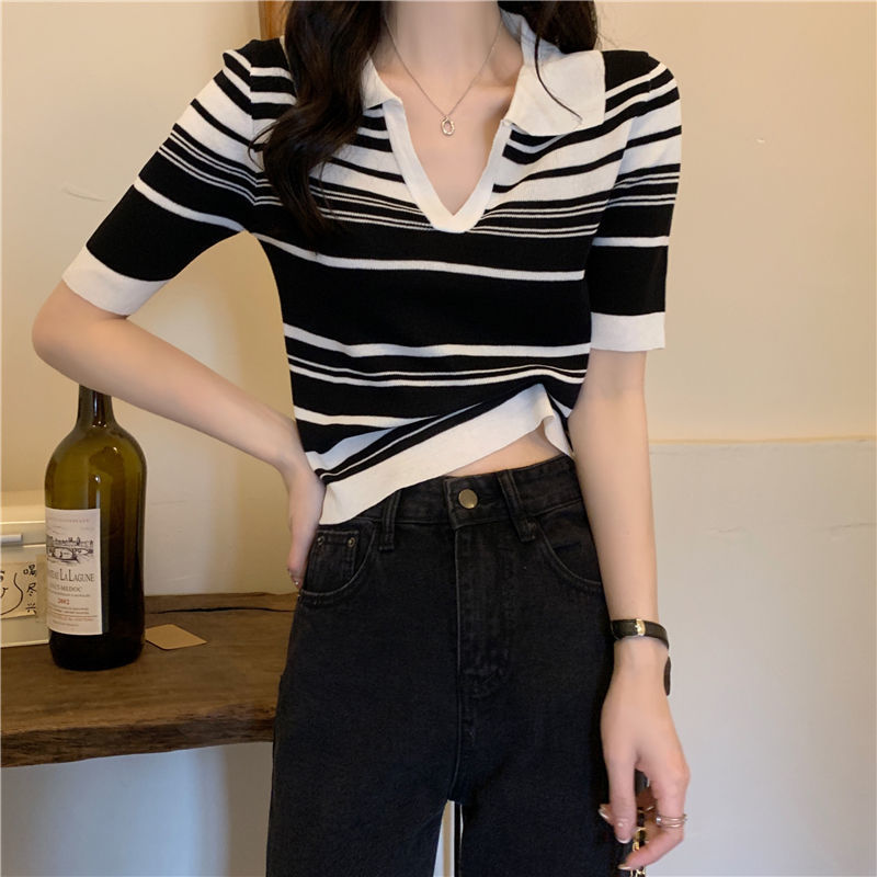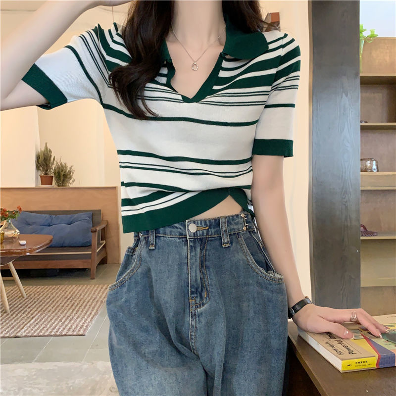• 商品名称:撞色条纹短袖恤女夏季薄款领修身设计感针织衫休闲百搭上衣