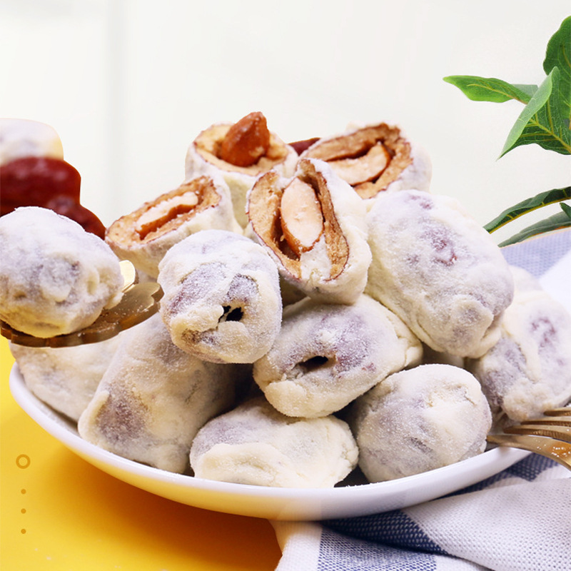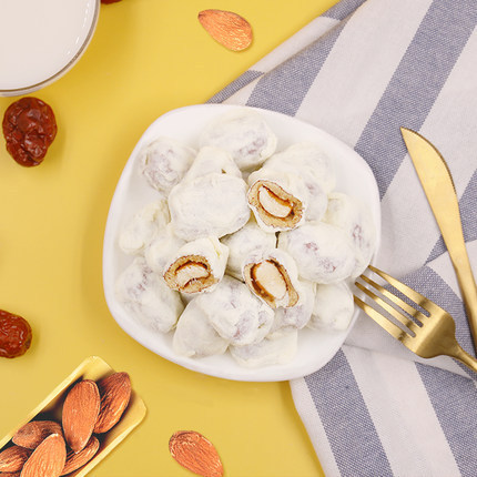 • 商品名称:内蒙特产巴旦木夹心奶枣 办公室休闲坚果零食杏仁夹心奶酪枣500g