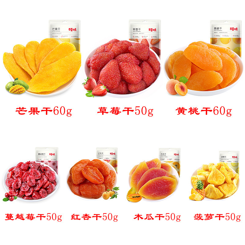 • 商品名称:百草味芒果干黄桃草莓干果脯蜜饯即食网红休闲零食水果干