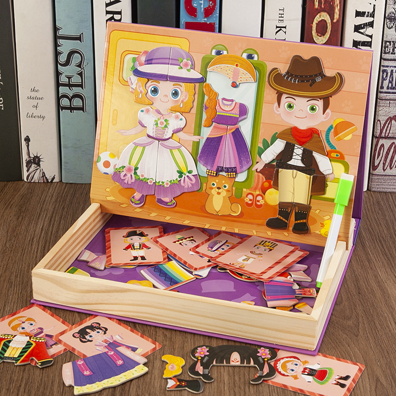 幼儿园生日礼物儿童益智磁性卡通人物女孩换装衣木制拼图画板礼盒