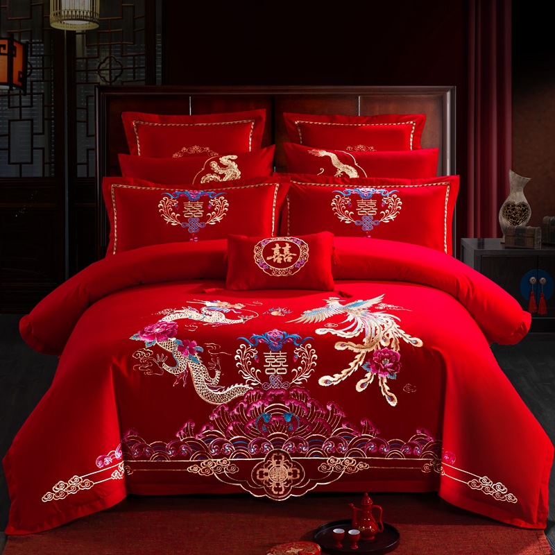 新款全棉大红四件套中式婚庆床单龙凤刺绣纯棉结婚多件套