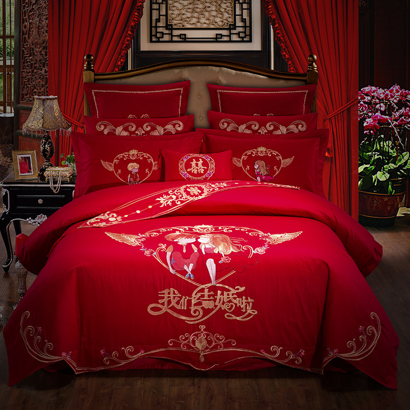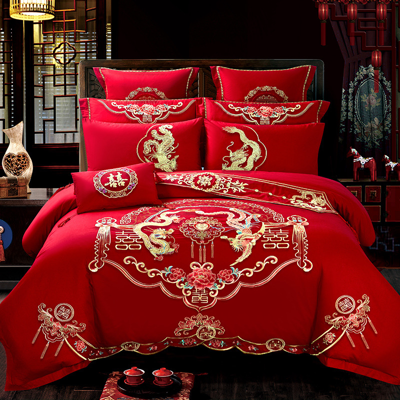 • 商品名称:新款全棉大红四件套中式婚庆床单龙凤刺绣纯棉结婚多件套