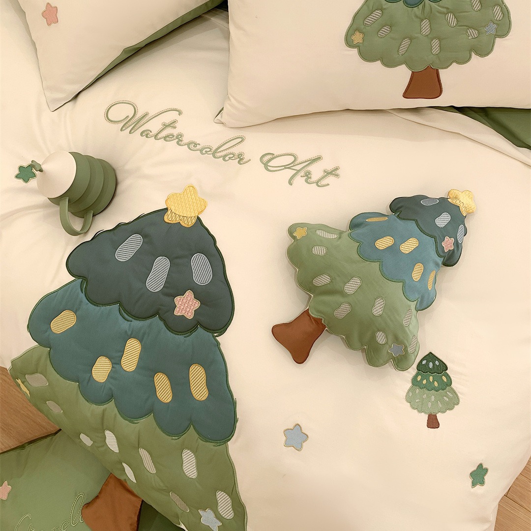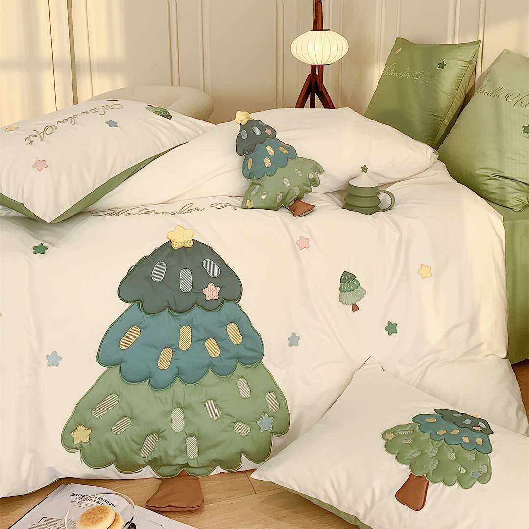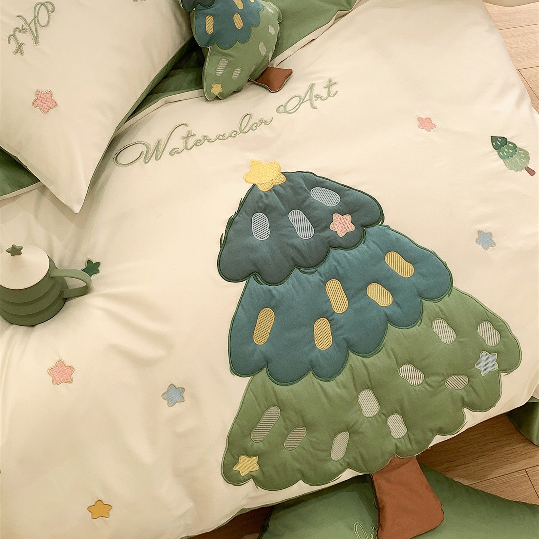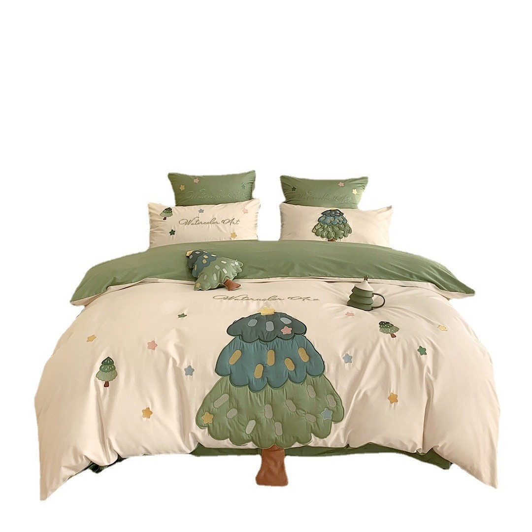 小清新卡通风刺绣被套床上用品多件套纯棉长绒棉四件套家纺棵棵树