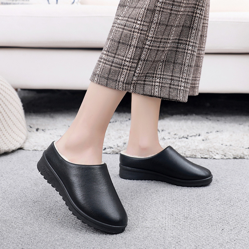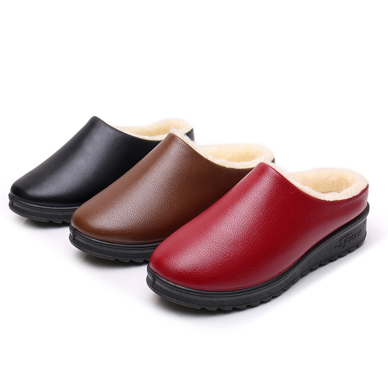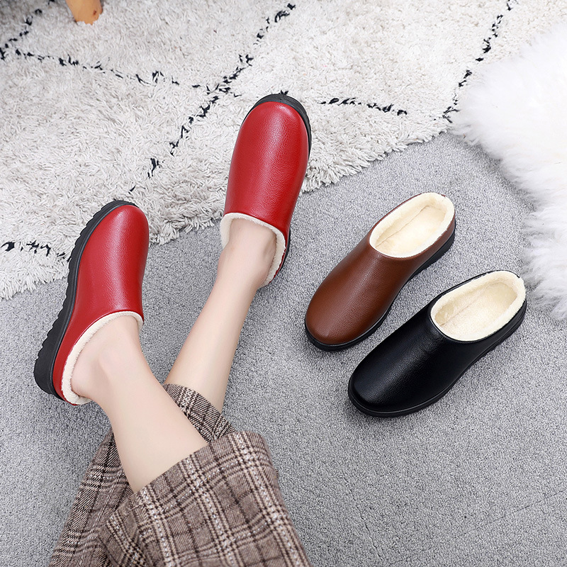 • 商品名称:冬季新款女士加绒保暖防滑懒人一脚蹬室内外半托居家防水PU棉拖鞋