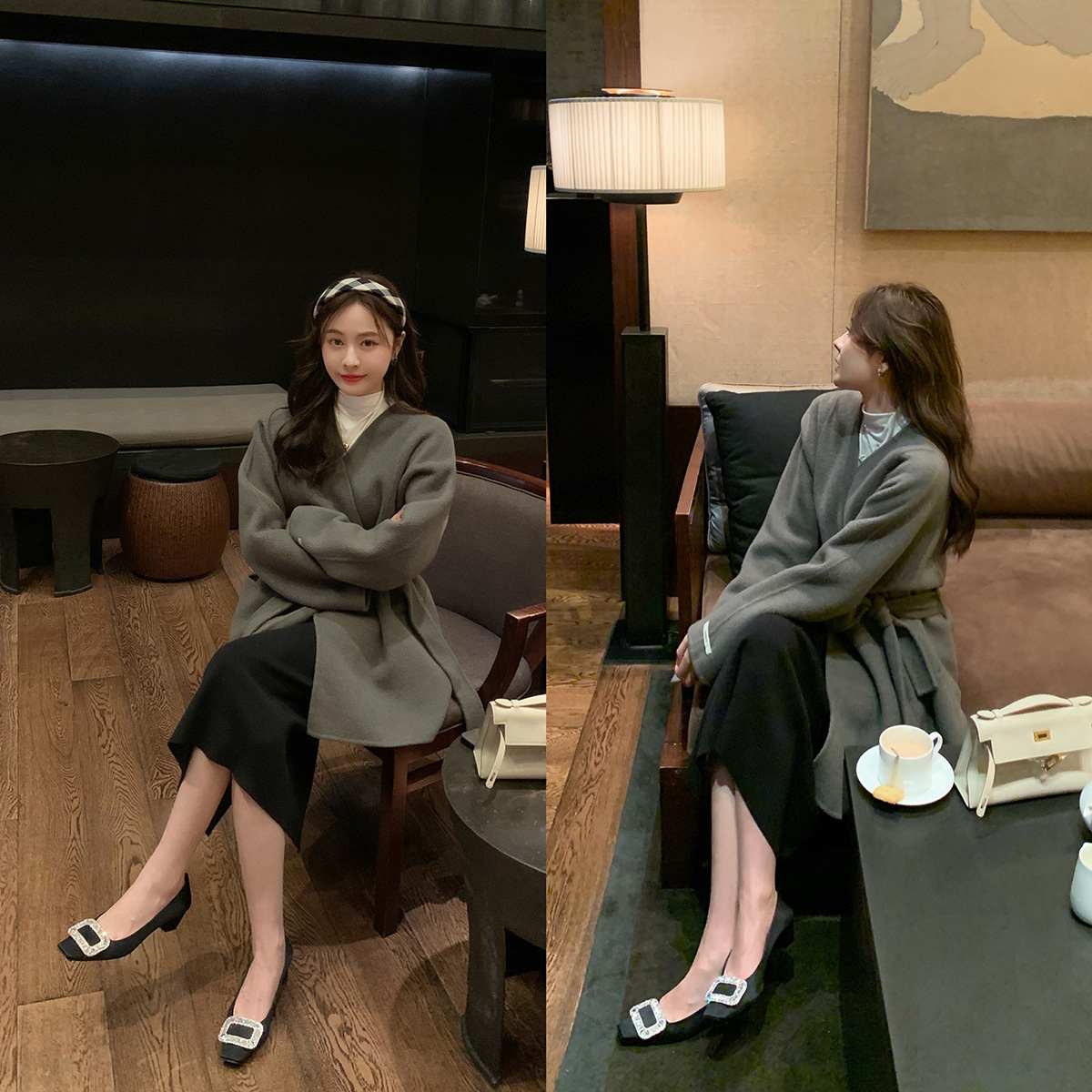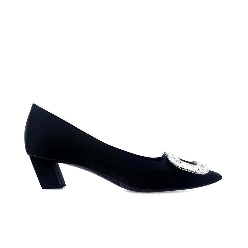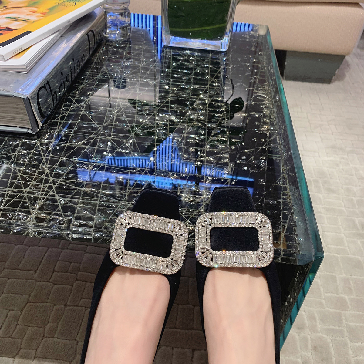 • 商品名称:2024春秋新款RV浅口方头粗跟高跟鞋绸缎面平底中跟方扣水钻单鞋女