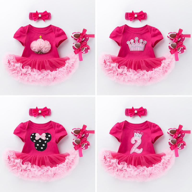 • 商品名称:跨境2023新款夏装女宝宝节日卡通短袖玫红哈衣裙三件套装生日童裙