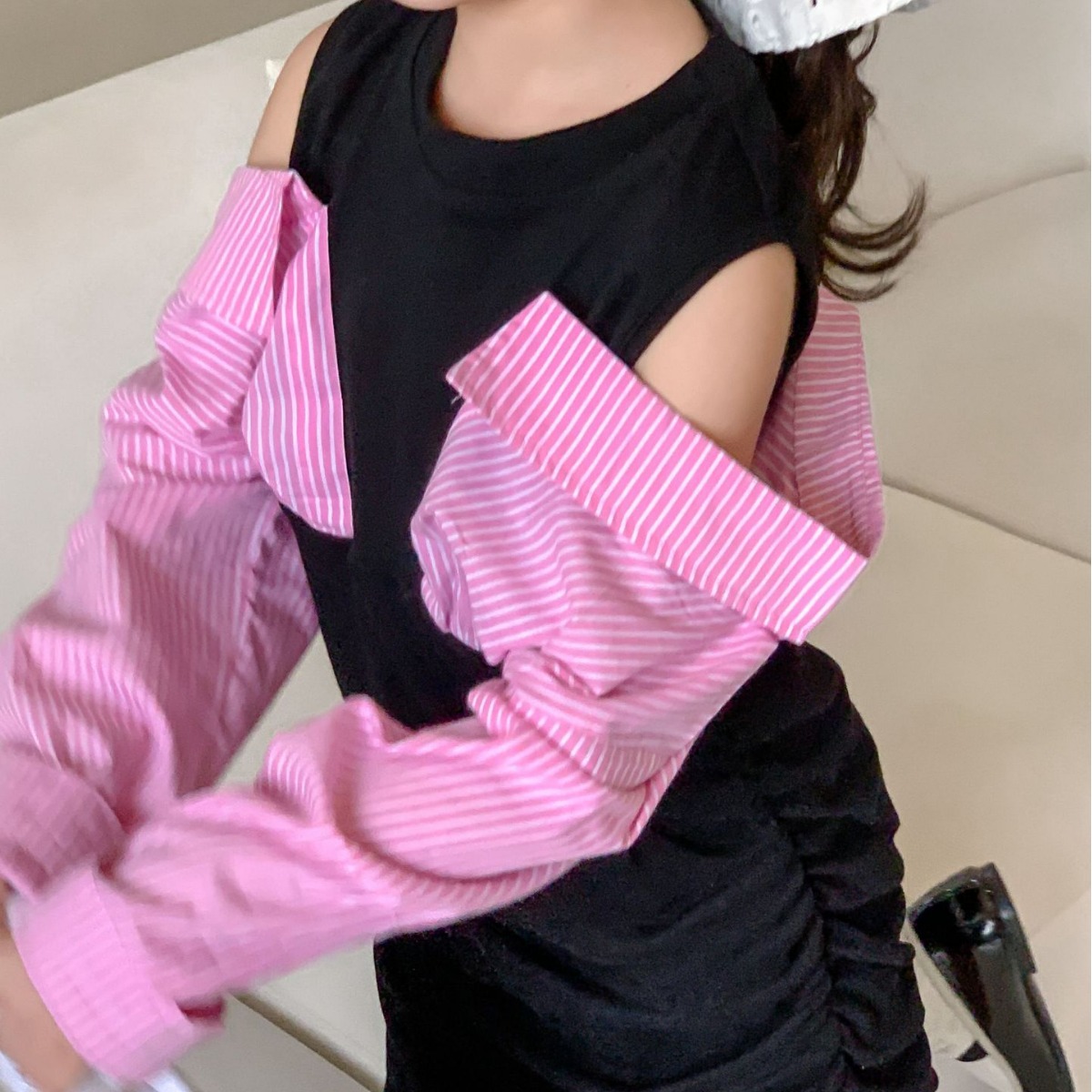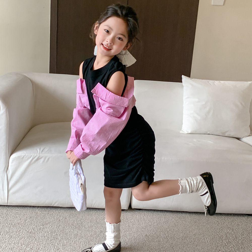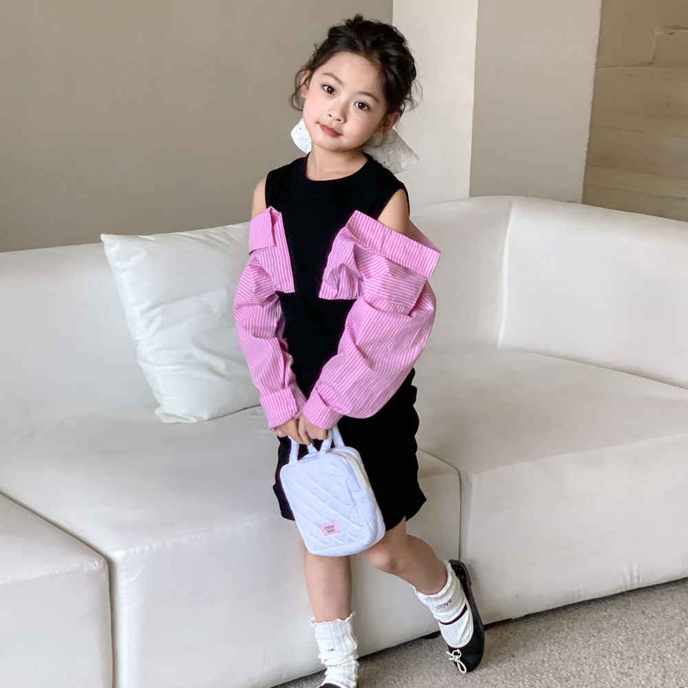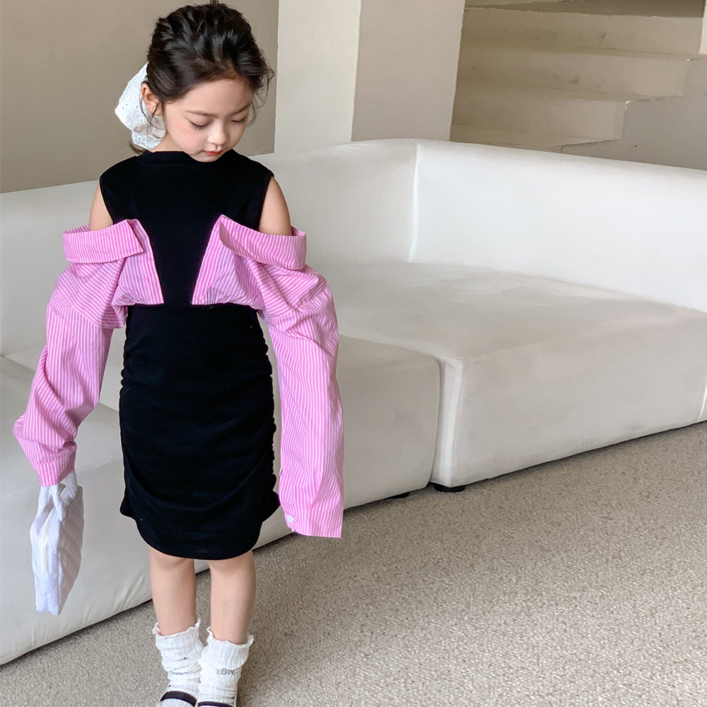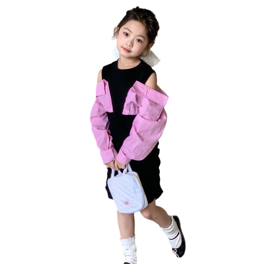 • 商品名称:童裙2024春款女童假两件露肩连衣裙中大童女宝辣妹风衬衫袖连衣裙