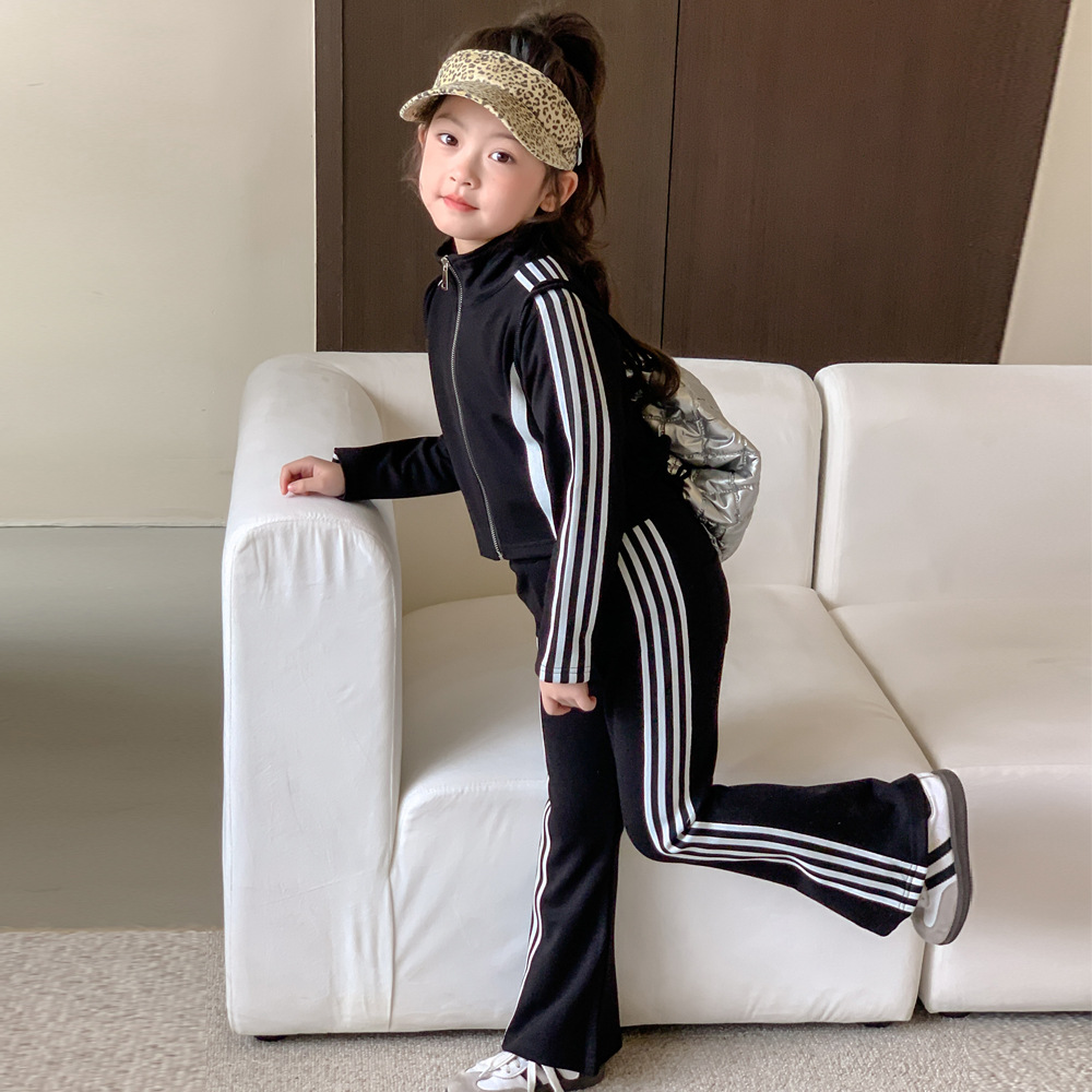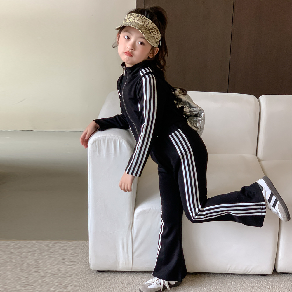 童装2024春女童修身拼色休闲套装中大童女宝长袖外套喇叭裤两件套