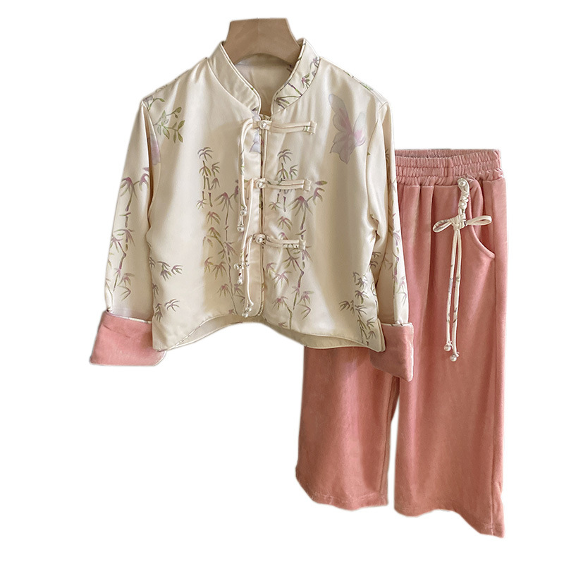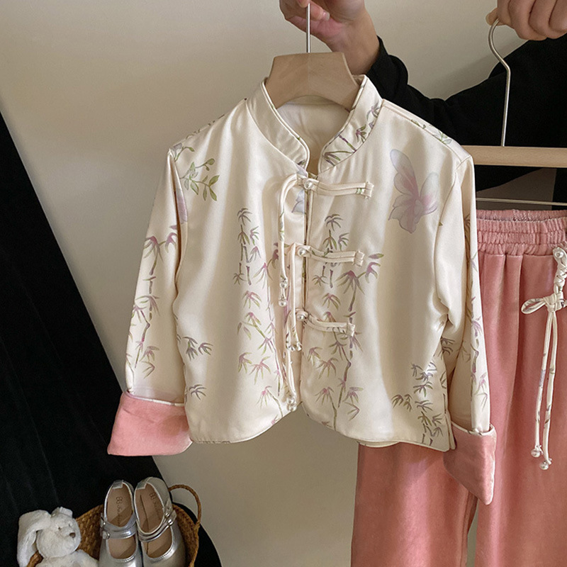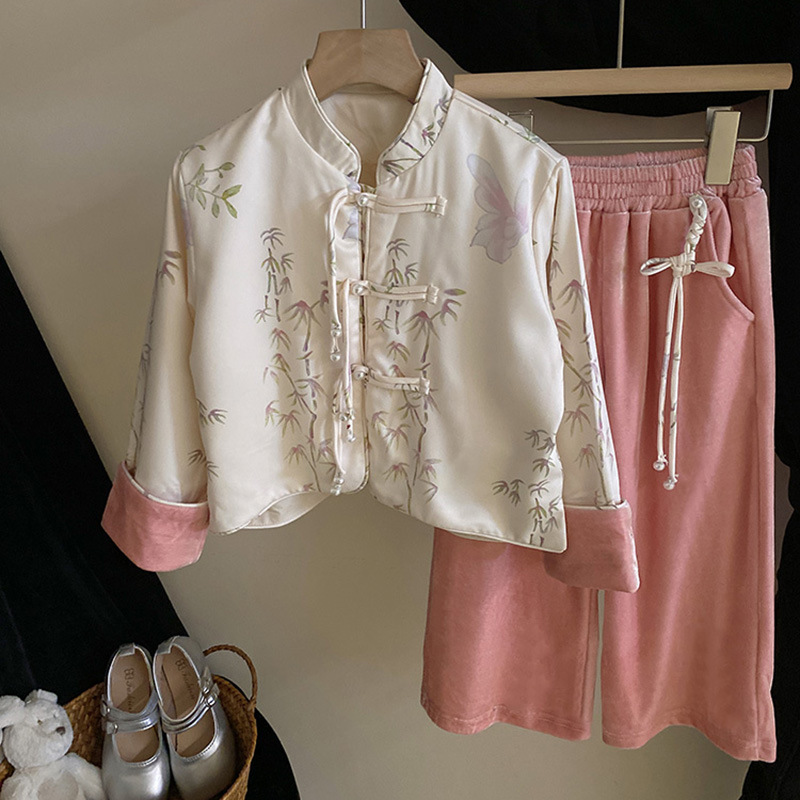 • 商品名称:女童国风新中式套装2024洋气立领盘扣上衣外套设计感丝绒阔腿裤潮
