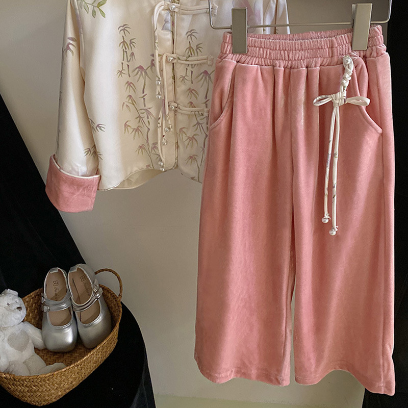 女童国风新中式套装2024洋气立领盘扣上衣外套设计感丝绒阔腿裤潮